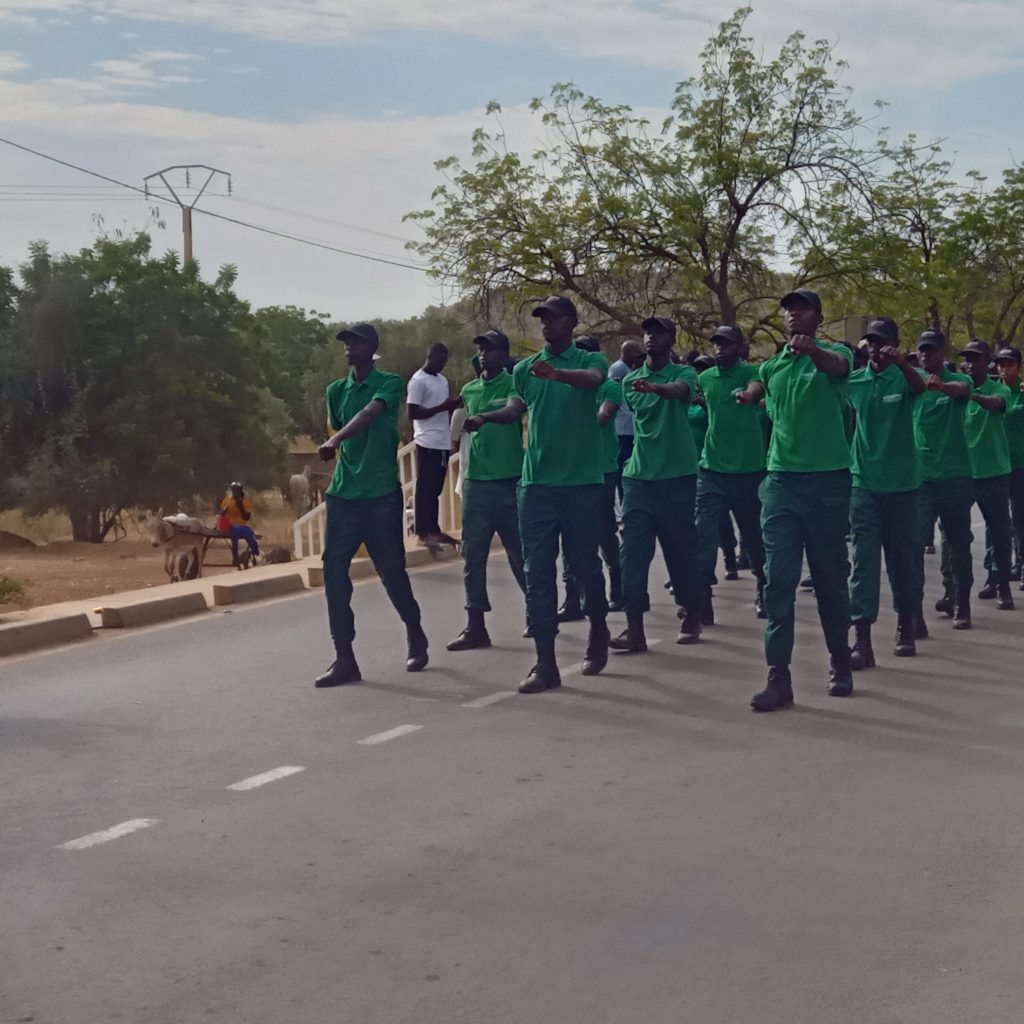 Après la levée des couleurs et le dépôt des gerbes de fleurs, les Troupes sont allées sur la route qui passe devant ce Camp inauguré, il y a trente ans, le 24/4/1995 par le Ministre des Forces Armées monsieur Cheikh Hamidou Kane en présence du CEMGA , le Général Mouhamadou Keita.